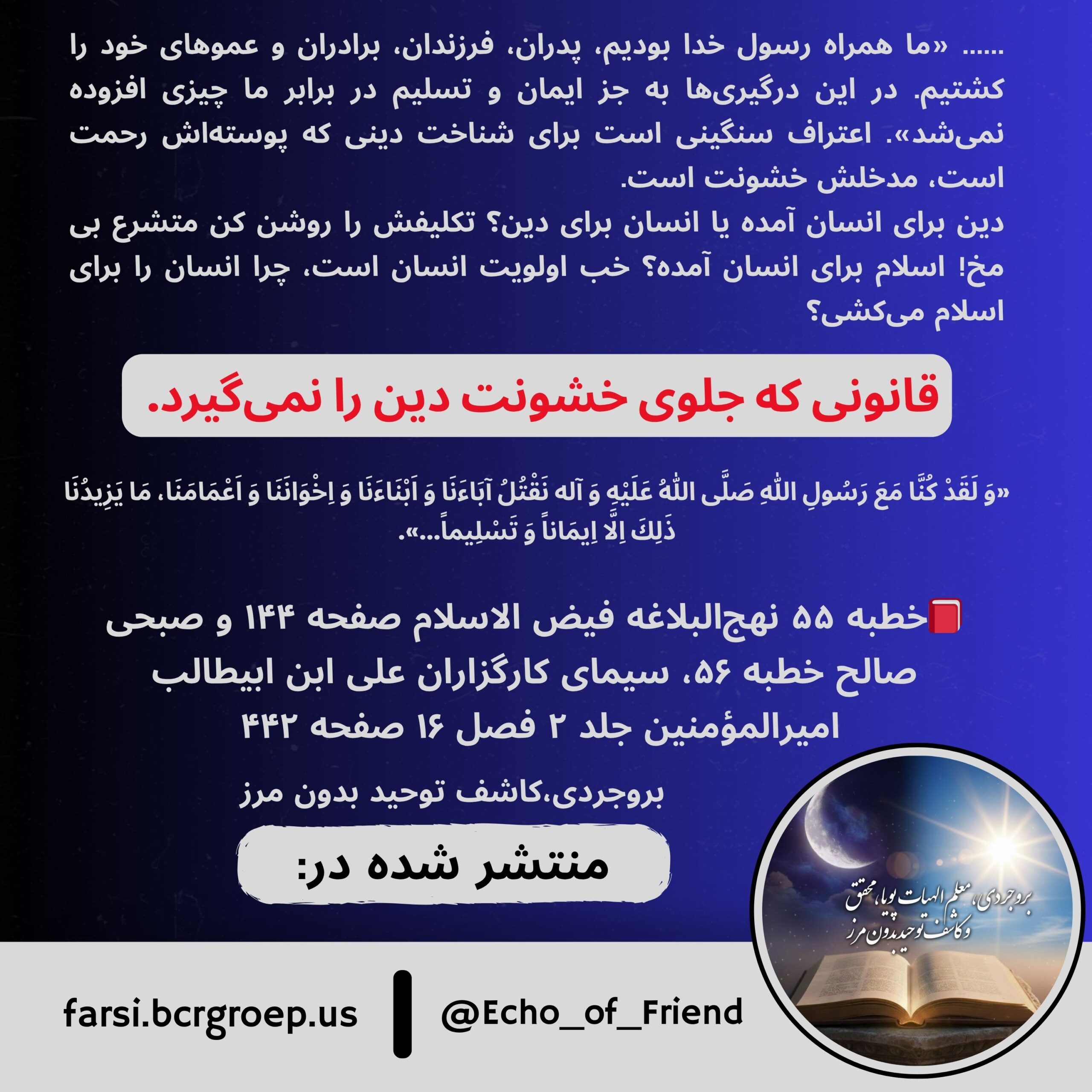 علی مرتضی میگوید: «ما همراه رسول خدا بودیم، پدران، فرزندان، برادران و عموهای خود را کشتیم. در این درگیریها به جز ایمان و تسلیم در برابر ما چیزی افزوده نمیشد». اعتراف سنگینی است برای شناخت دینی که پوستهاش رحمت است، مدخلش خشونت است. این اتهام به علی نمیچسبد، برای اینکه امیر بارها عملاً برائت خودش را از این باد هوا که نامش الله است اعلام کرده، میخواهد بگوید دین، پدر و مادر سرش نمیشود، بچه و برادر سرش نمیشود، به تو میگوید بکش، اگر نکشی حکم الله را اجرا نکردی، خودت باید کشته بشوی. قانون فرار از جنگ در زمان جنگ، این قانون در زمان جنگ اجرا میشود در عالم سیاست ولی در دین یک حکم عمومی است.