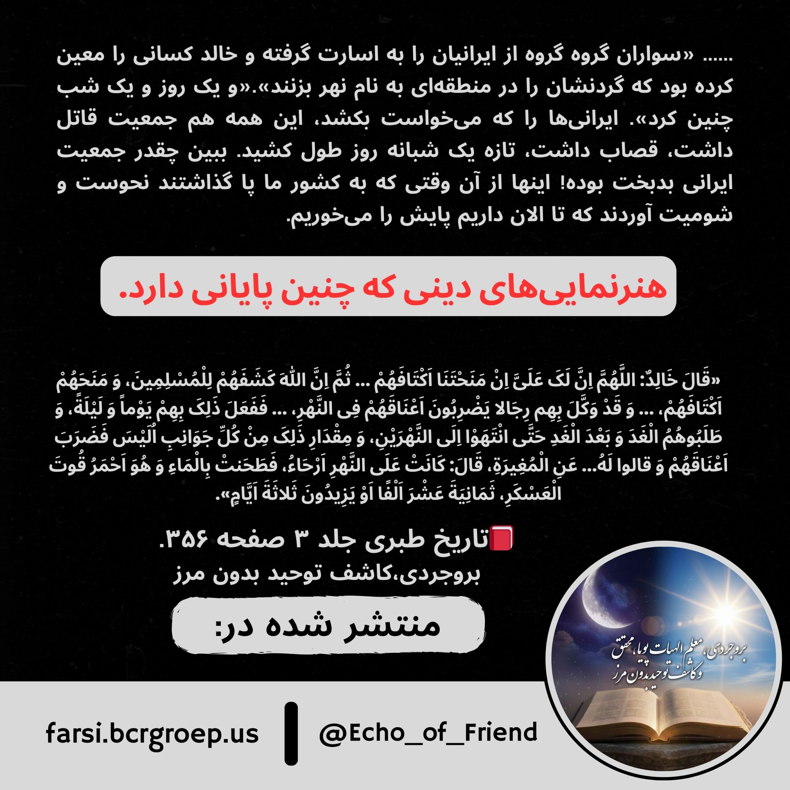 ▪️«قَالَ خَالِدٌ: اللَّهُمَّ اِنَّ لَکَ عَلَیَّ اِنْ مَنَحْتَنَا اَکْتَافَهُمْ … ثُمَّ اِنَّ اللهَ کَشَفَهُمْ لِلْمُسْلِمِینَ، وَ مَنَحَهُمْ اَکْتَافَهُمْ، … وَ قَدْ وَکَّلَ بِهِم رِجَالا یَضْرِبُونَ اَعْنَاقَهُمْ فِی النَّهْرِ، … فَفَعَلَ ذَلِکَ بِهِمْ یَوْماً وَ لَیْلَةً، وَ طَلَبُوهُمُ الْغَدَ وَ بَعْدَ الْغَدِ حَتَّى انْتَهَوْا اِلَى النَّهْرَیْنِ، وَ مِقْدَارِ ذَلِکَ مِنْ کُلِّ جَوَانِبِ اُلَیْسَ فَضَرَبَ اَعْنَاقَهُمْ وَ قالوا لَهُ… عَنِ الْمُغِیرَةِ، قَالَ: کَانَتْ عَلَى النَّهْرِ اَرْحَاءُ، فَطَحَنتْ بِالْمَاءِ وَ هُوَ اَحْمَرُ قُوتَ الْعَسْکَرِ، ثَمَانِیَةَ عَشْرَ اَلْفًا اَوْ یَزِیدُونَ ثَلاثَةَ اَیَّامٍ».